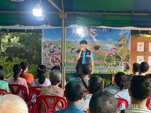 วันที่ 20 มิถุนายน 2568 ณ ศูนย์การเรียนรู้โคก หนอง นา พัฒนาชุมชน กรรวิวัฒน์ฟาร์ม หมู่ที่ 5 ตำบลไทรทอง อำเภอชัยบุรี จังหวัดสุราษฎร์ธานี ธนาคารเพื่อการเกษตรและสหกรณ์การเกษตร สาขาชัยบุรี ร่วมกับสำนักงานพัฒนาชุมชนอำเภอชัยบุรี และสำนักงานเกษตรอำเภอชัยบุรี ดำเนินโครงการฟื้นฟูพัฒนาศักยภาพลูกค้่พักชำระหนี้ ระยะที่ 2 ตามหลักการ “ตลาดนำ นวัตกรรมเสริม เพิ่มรายได้” โดยมีเป้าหมายเป็นลูกหนี้ที่ขอพักชำระ จำนวน 80 คน โดยมีวัตถุประสงค์เพื่อลดภาระหนี้และฟื้นฟูศักยภาพในการประกอบอาชีพของลูกหนี้ ศูนย์เรียนรู้โคก หนอง นา แปลงนายนิวัฒน์ แหลมชัย เป็นศูนย์เรียนรู้ที่ขับเคลื่อนกิจกรรมตามหลักปรัชญาของเศรษฐกิจพอเพียง ซึ่งมีฐานการเรียนรู้ให้ผู้พักชำระหนี้ของธาคาร ธกส. ได้นำไปปรับใช้ในชีวิต ในครัวเรือนตนเอง ประกอบด้วย ฐานการเรียนรู้การเลี้ยงไก่ไข่ ฐานการเรียนรู้การเพาะเห็ดนางฟ้า ฐานการเรียนรู้การปลูกผัก ฐานการเรียนรู้การทำน้ำหมัก ฐานการเรียนรู้การเผาถ่าน เป็นต้น ในการนี้ พันจ่าอากาศเอกพนม ปัญญาวงค์ รักษาราชการแทนพัฒนาการอำเภอชัยบุรี พร้อมด้วยเจ้าหน้าที่พัฒนาชุมชนอำเภอ ร่วมเป็นวิทยากรให้ความรู้แก่ผู้เข้าร่วมกิจกรรม